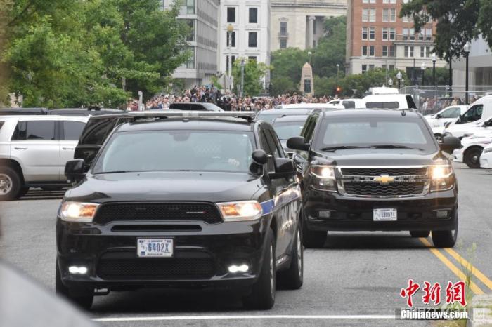 资料图:当地时间2023年8月3日,美国前总统特朗普在首都华盛顿一家联邦法院出庭应诉,对试图推翻2020年总统大选结果的指控表示不认罪。图为结束出庭后,特朗普车队驶离联邦法院。 中新社记者 沙晗汀 摄