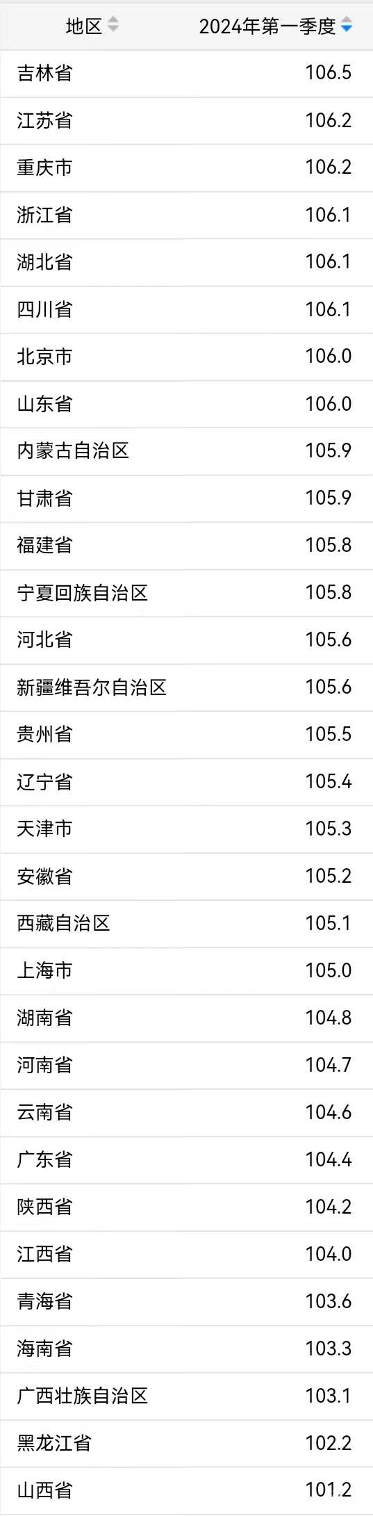 其中,吉林以6.5%的增速排名第一,高于全国1.2个百分点,领跑全国。一季度GDP同比增速达到“6字头”的还有江苏和重庆(同为6.2%),浙江、四川、湖北(同为6.1%),山东和北京(同为6.0%)。