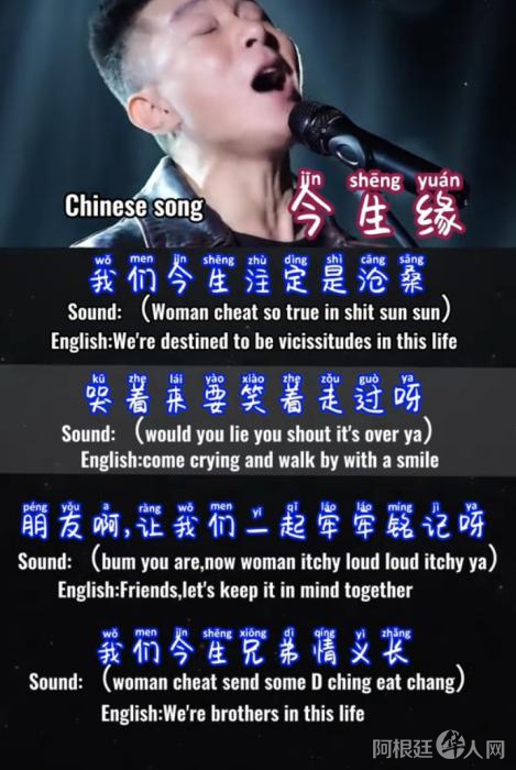 有人说是因为谐音梗,开头的“我们今生有缘在路上”前三个字,空耳听的话,很像英文: