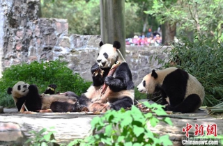 4月21日,中国大熊猫保护研究中心都江堰基地的大熊猫享用美食,憨态可掬。 中新社记者 安源 摄