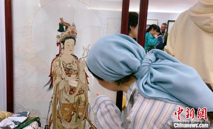 来自塔吉克斯坦的留学生美妍了解双面绣作品。林波摄