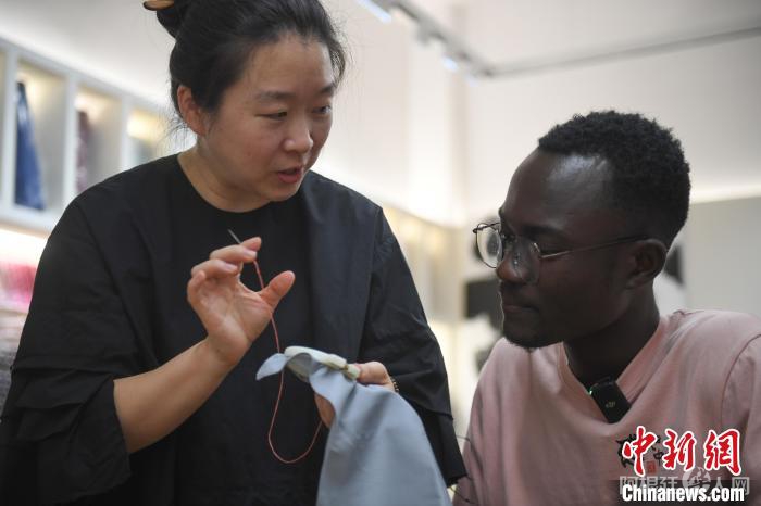 来自加纳的“洋弟子”温福体验杭绣。 王刚摄