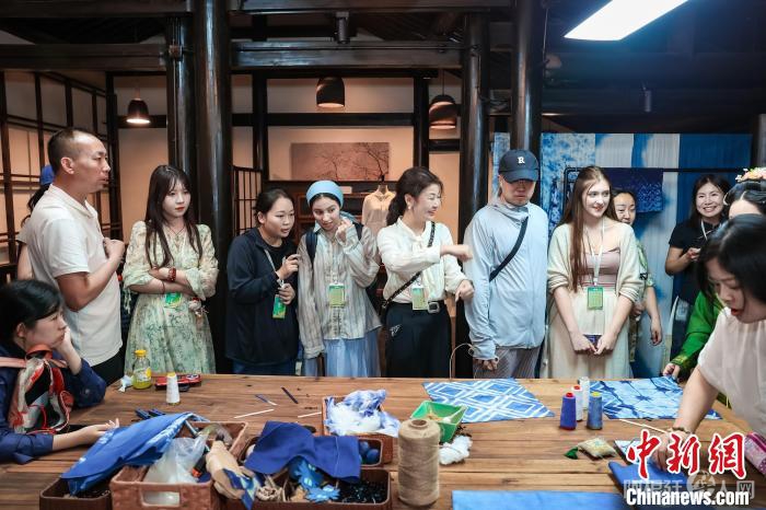 中新网绍兴5月25日电(林波)5月24日至26日,“今在上虞 遇见未来”青春之城全媒体采风行活动在浙江省绍兴市上虞区举行。其间,来自日本、加拿大、爱尔兰、澳大利亚等国家的华文媒体代表和“洋弟子”们走进上虞里直街,体验非遗项目——杭绣,了解蓝染,感受中国民间传统手工艺的魅力。