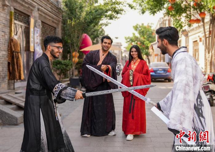 图为邯森等4名巴基斯坦留学生在回车巷历史文化街区穿汉服,感受中国传统文化。王倩倩 摄