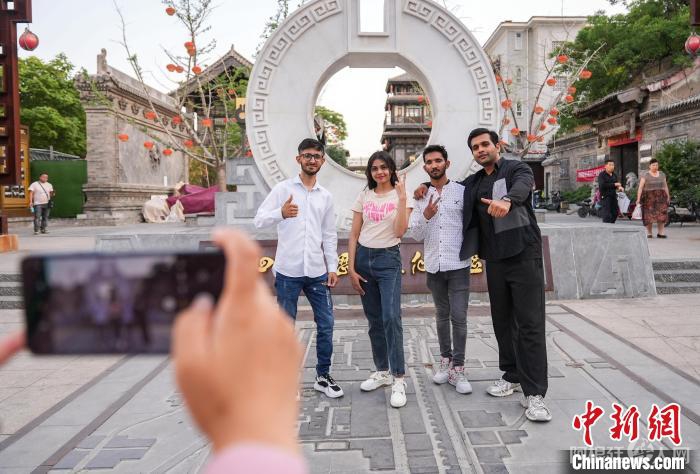 图为邯森等4名巴基斯坦留学生在回车巷历史文化街区拍照留念。王倩倩摄