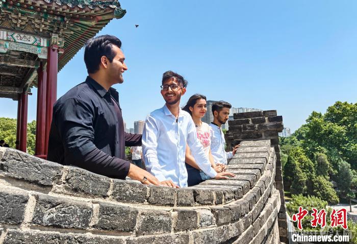 图为邯森等4名巴基斯坦留学生登上丛台。王倩倩摄