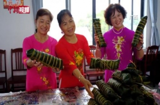 在广西柳州市柳城县华侨农场,当地印尼和越南的归侨侨眷齐聚一堂,共包特色的越南长粽。他们将香料腌制的大块五花肉、糯米、绿豆装入粽叶中,包制好的长粽壮如“手臂”,每个可重达二至三斤,煮熟需十小时以上。