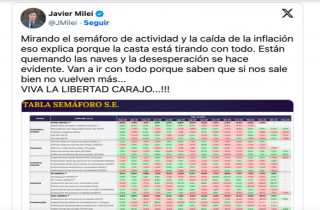米莱在文中附上了五月份各个行业的10项经济指标,其中一半是积极的,另一半是负面的。他表示:“他们正在全力反对,因为清楚,如若我们的进展顺利,则他们再也无法回到过去了。”在结尾处,他加上了一贯的语句:“自由万岁!”