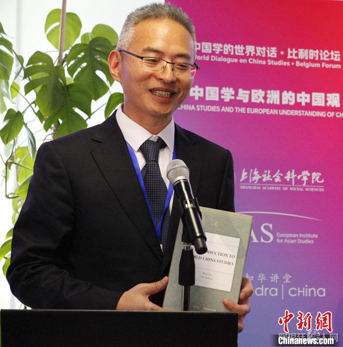 图为上海社会科学院世界中国学研究所所长沈桂龙介绍《世界中国学概论》英文版。 中新社记者 德永健 摄