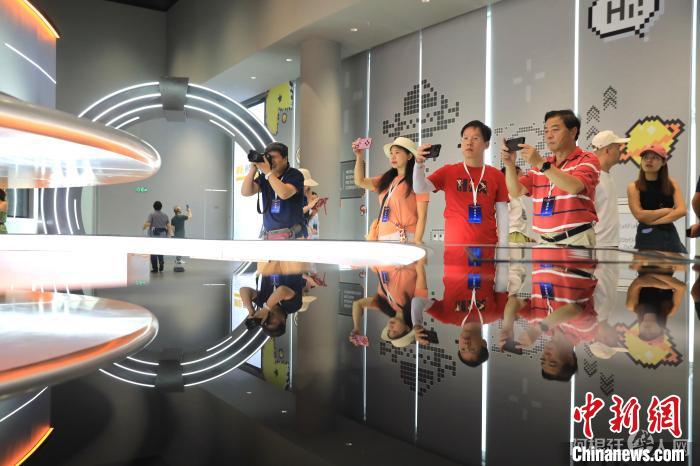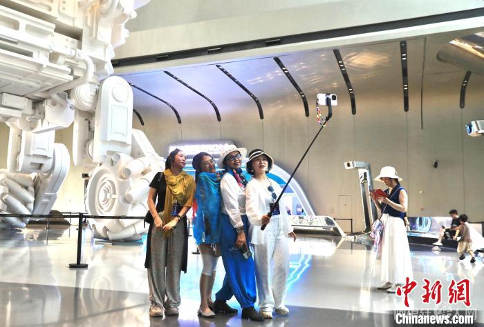 7月4日,来自19个国家的24家华文媒体代表走进位于四川省成都市郫都区的成都科幻馆,感受独特的“科幻巧思”。图为海外华文媒体代表在展厅参观拍摄。中新社记者 王磊 摄