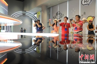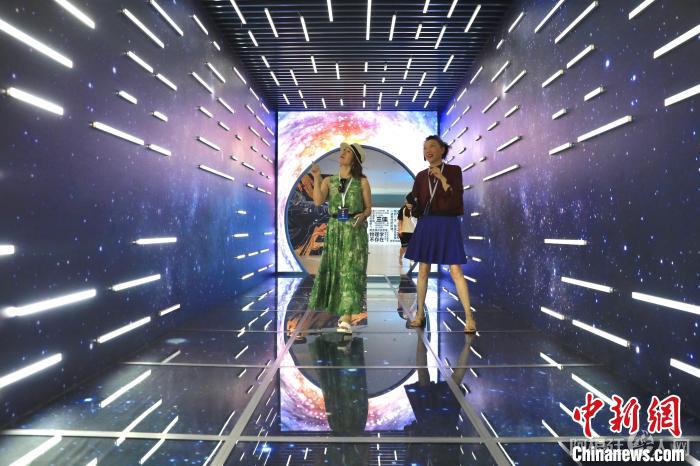 7月4日,来自19个国家的24家华文媒体代表走进位于四川省成都市郫都区的成都科幻馆,感受独特的“科幻巧思”。图为海外华文媒体代表被科幻感十足的视觉长廊所吸引。中新社记者 王磊 摄