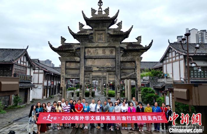 7月5日,来自19个国家的24家华文媒体来到“中国石牌坊之乡”四川隆昌,漫步在巴蜀古驿道,感受独特的“牌坊文化”。图为海外华文媒体代表在南关石牌坊古镇合影。中新社记者 王磊 摄