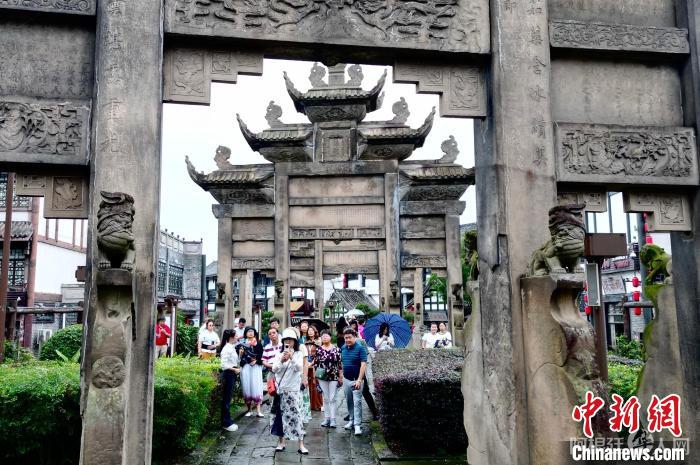 7月5日,来自19个国家的24家华文媒体来到“中国石牌坊之乡”四川隆昌,漫步在巴蜀古驿道,感受独特的“牌坊文化”。图为海外华文媒体代表在南关石牌坊古镇参观。中新社记者 王磊...