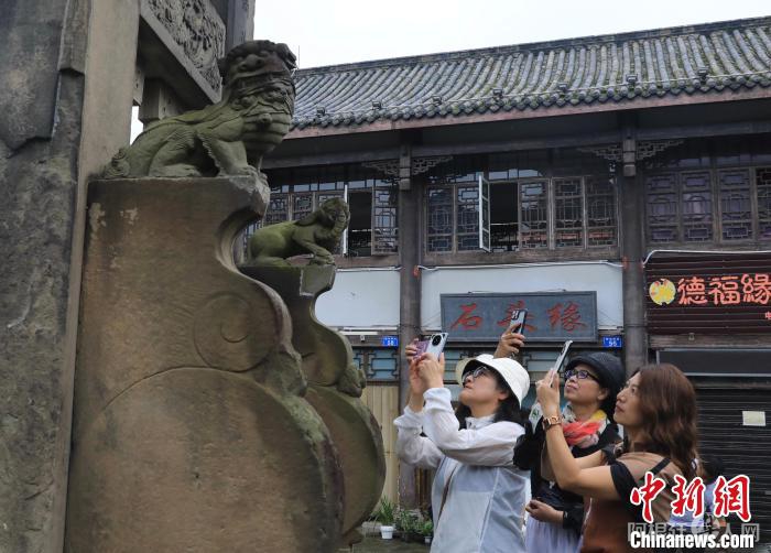 7月5日,来自19个国家的24家华文媒体来到“中国石牌坊之乡”四川隆昌,漫步在巴蜀古驿道,感受独特的“牌坊文化”。图为海外华文媒体代表拍摄石牌坊上的石兽。中新社记者 王磊 摄