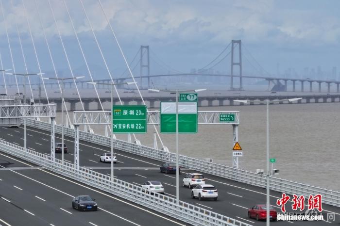资料图:6月30日15时,历经逾7年的建设,粤港澳大湾区核心工程深中通道通车试运营。图为广东中山,车辆行驶在深中大桥上。中新社记者 陈骥旻 摄