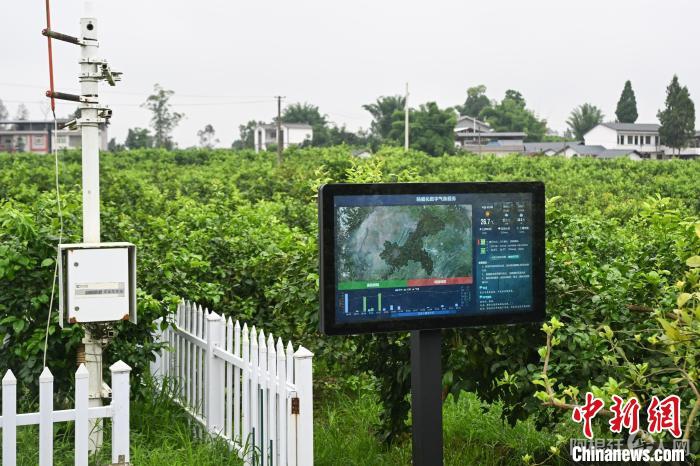 7月8日,重庆潼南,精细化数字气象服务“守护”柏梓镇小岭村柠檬基地。当日,“行走中国·2024海外华文媒体川渝行”参访团一行走进重庆市潼南区,实地了解当地柠檬产业发展。据悉,重庆潼南是世界三大柠檬产地之一,柠檬种植面积达32万亩,柠檬鲜果及柠檬产品远销俄罗斯、新加坡、东南亚等30多个国家和地区。近年来,“潼南柠檬”从技术研发、种苗培育、标准化种植、精深加工等为一体的柠檬全产业链在当地日臻完善。中新社记者 何蓬磊 摄