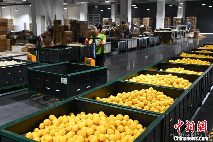 7月8日,在位于重庆潼南的雪王农业(重庆)有限公司,工人在打包柠檬鲜果。当日,“行走中国·2024海外华文媒体川渝行”参访团一行走进重庆市潼南区,实地了解当地柠檬产业发展。据悉,重庆潼南是世界三大柠檬产地之一,柠檬种植面积达32万亩,柠檬鲜果及柠檬产品远销俄罗斯、新加坡、东南亚等30多个国家和地区。近年来,“潼南柠檬”从技术研发、种苗培育、标准化种植、精深加工等为一体的柠檬全产业链在当地日臻完善。中新社记者 何蓬磊 摄