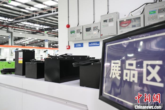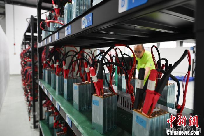 梯次利用电池展示。据悉,动力电池退役时还有剩余储电能力,规范处理后可梯次利用。近年来,重庆市潼南区围绕废旧动力电池梯次利用、报废汽车拆解和汽车零部件再制造等业态,加快推进汽车后市场产业布局,全力打造中国第一汽车后市场基地。中新社记者 何蓬磊 摄