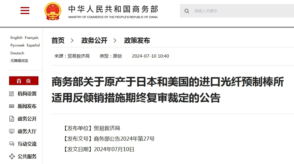 2023年7月10日,应中国光纤预制棒产业申请,商务部发布2023年第24号公告,决定自2023年7月11日起,对原产于日本和美国的进口光纤预制棒所适用的反倾销措施进行期终复审调查。