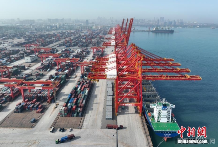 资料图:山东日照港全自动化集装箱码头作业现场。(无人机图片)中新社记者 毛建军 摄