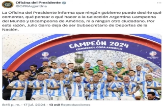 阿根廷总统办公室本周三通过一份公告表示:“总统办公室告知,任何政府都不能决定作为世界杯冠军及美洲杯卫冕冠军的阿根廷国家队,亦或其他公民说什么,想什么或做什么。基于此原因,胡里奥·加罗不再担任国家体育副秘书长。”