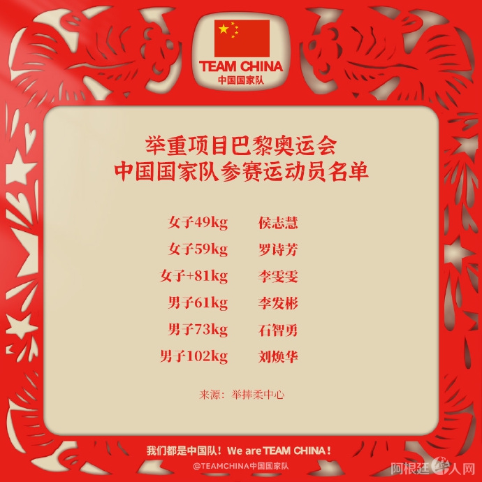 中国举重队参赛名单。图片来源:中国国家队社交媒体