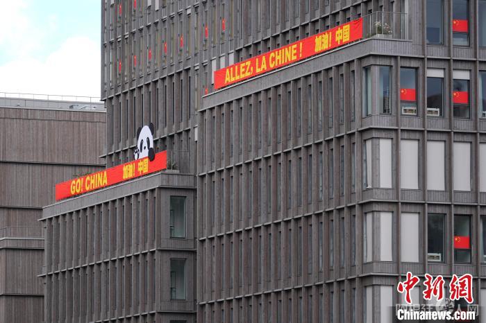 桥的一端,正是中国体育代表团驻地。除了挂着五星红旗,还有“加油!中国”字样的横幅,一只可爱的“大熊猫”从横幅上探出脑袋,像是在和世界各地的运动员打招呼。