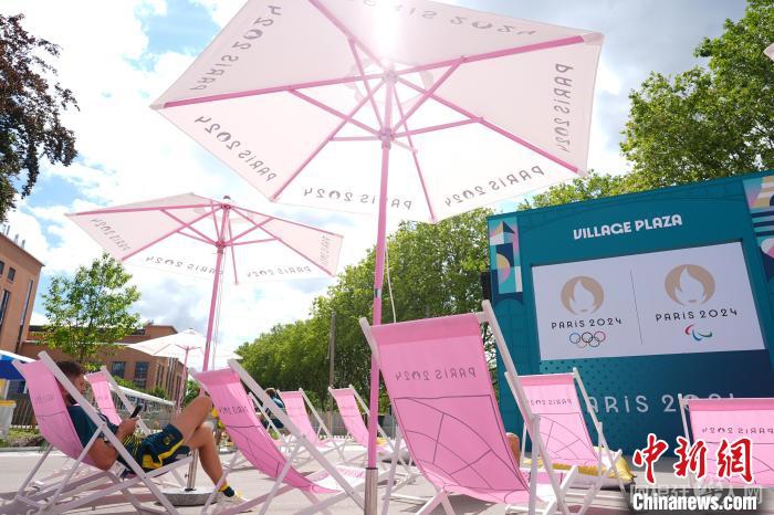 广场区是巴黎奥运村核心区域,场地中心树立一块大屏,屏幕前摆放着粉色躺椅和遮阳伞,仿佛夏日沙滩派对。运动员可以在这里一边放松社交,一边观看奥运转播。