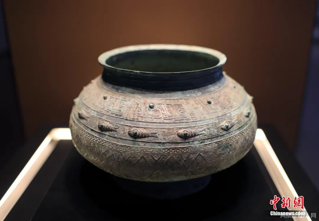 展览现场展出的一件铜瓿保存状况完整,上有细腻的雷云纹和卷云纹。据余健介绍,这种造型的器物在三星堆为首次发现,其功能还有待进一步研究。