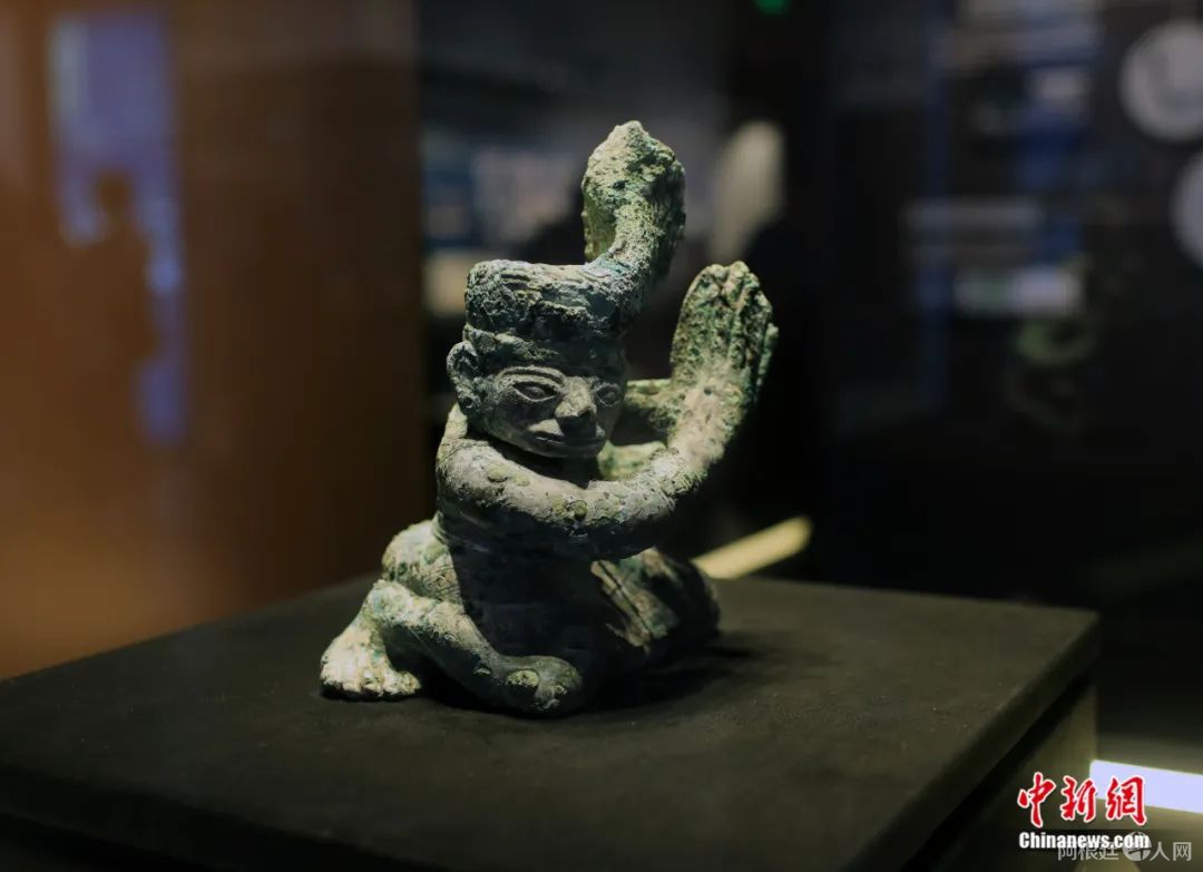 余健介绍,本次展出的青铜扭头跪坐人像,由很多残件修复而成,最大的困难在于不采用传统焊接和拼接的工艺进行复原,而是通过物理加固的方式复原,这件器物体现了传统修复工艺在文物保护修复工作中的应用。
