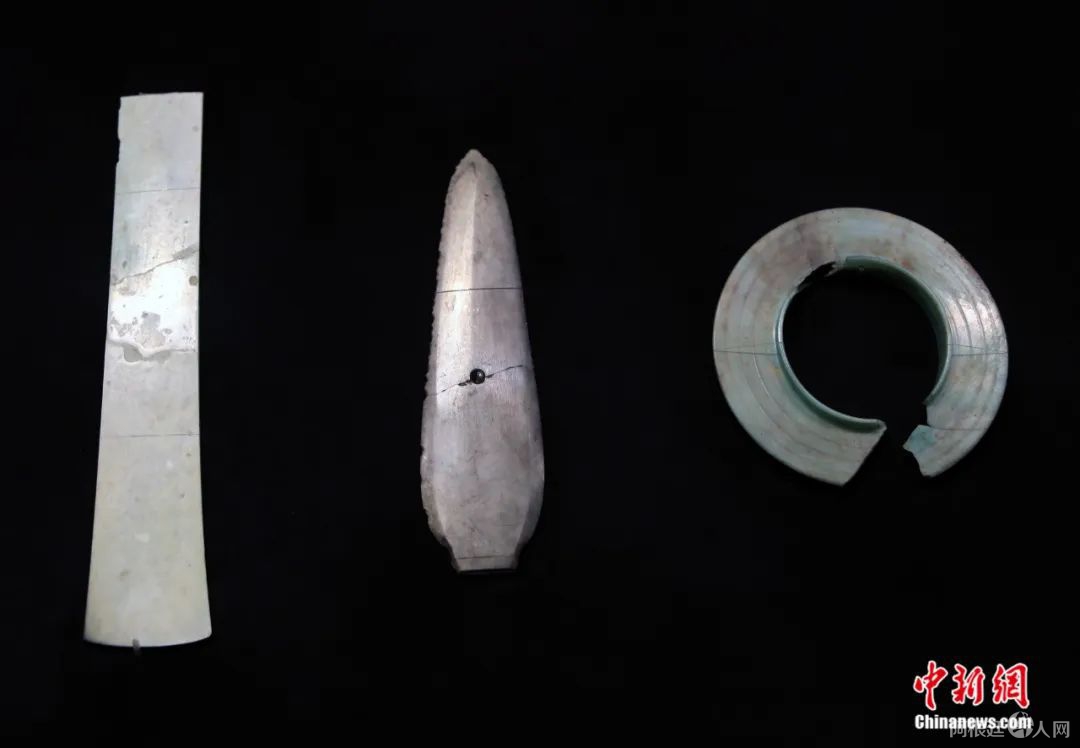 玉凿(左)、玉矛(中)及玉有领璧(右)。王磊 摄