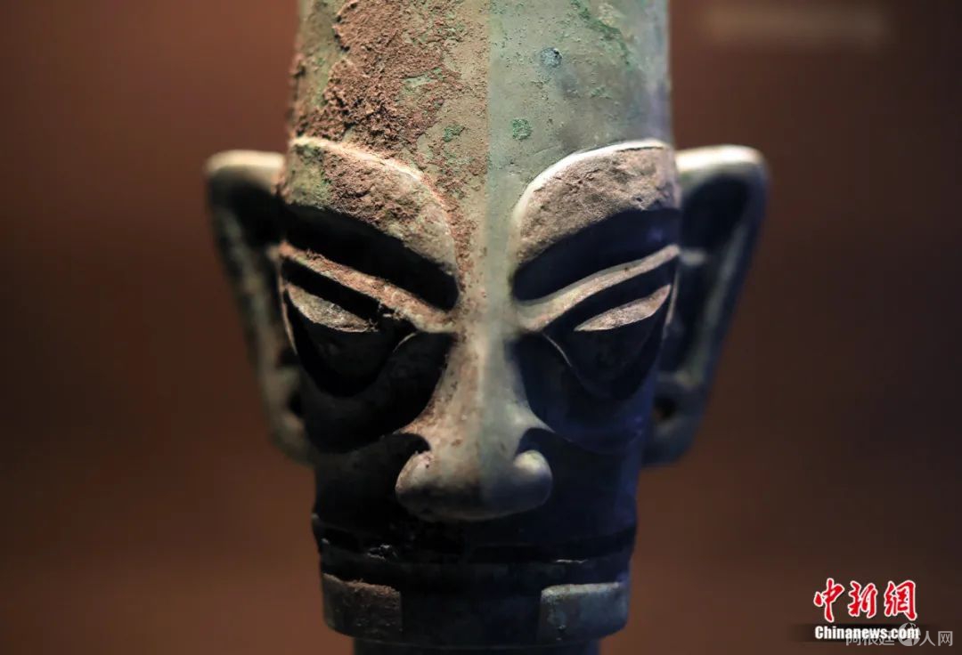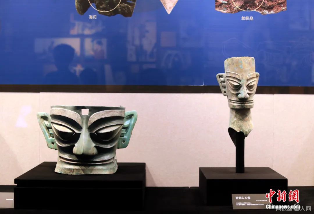 青铜面具(左)及青铜人头像(右)。王磊 摄