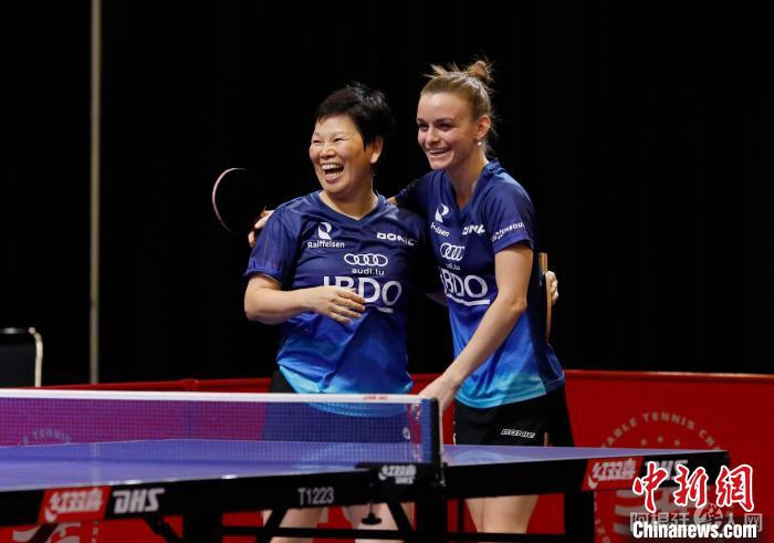 当地时间11月25日,倪夏莲(左)和DE NUTTE Sarah在比赛中。当日,在美国休斯敦举行的2021世界乒乓球锦标赛女子双打比赛中,卢森堡组合倪夏莲(左)/DE NUTTE Sarah战胜对手,晋级16强。中新社记者刘关关摄