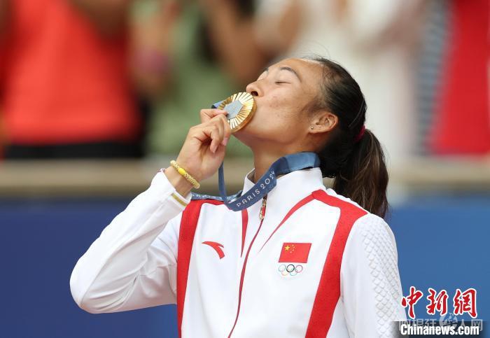 当地时间8月3日,在巴黎奥运会网球女子单打比赛中,中国选手郑钦文以2:0胜克罗地亚选手维基奇,获得金牌。图为郑钦文亲吻金牌。中新社记者富田摄