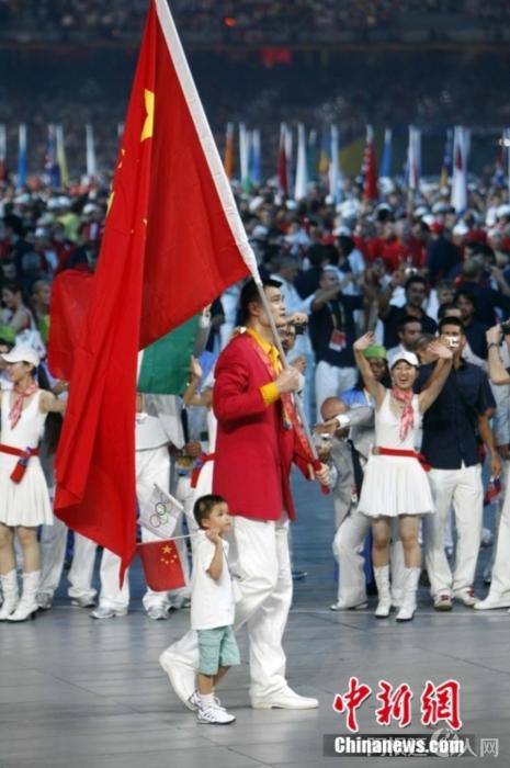 2008年,北京奥运会开幕式,中国代表团的旗手姚明携手“英雄少年”林浩步入国家体育场。中新社记者 杜洋 摄