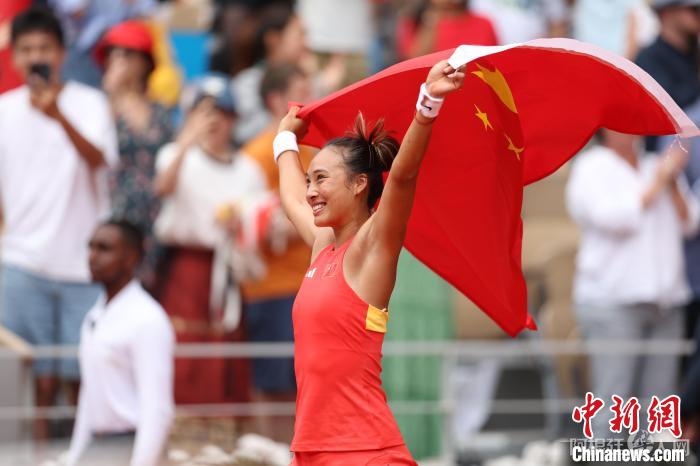 当地时间8月3日,在巴黎奥运会网球女子单打决赛中,中国选手郑钦文战胜克罗地亚选手维基奇。图为郑钦文庆祝夺冠。 中新社记者 富田 摄