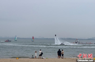 8月12日,厦门环东滨海旅游浪漫线上,游人前来体验水上运动项目。 中新社记者 商永 摄