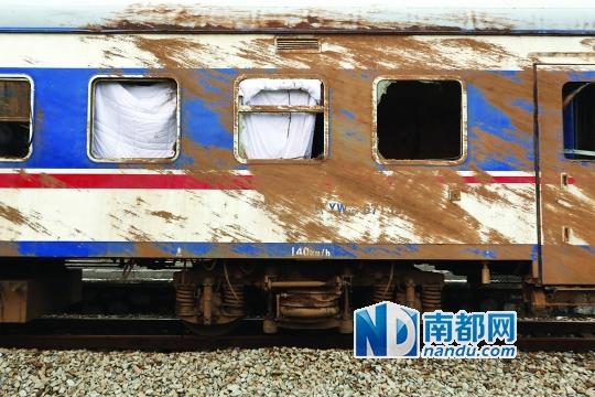 T171次受损的硬卧车厢,车厢外布满了泥泞。车窗被打破,车内一片狼藉。南都记者 张志韬 摄南都讯昨晨5时左右,京广线英德境内高桥至沙口区段受持续强降雨影响山体塌方,造成南昌...