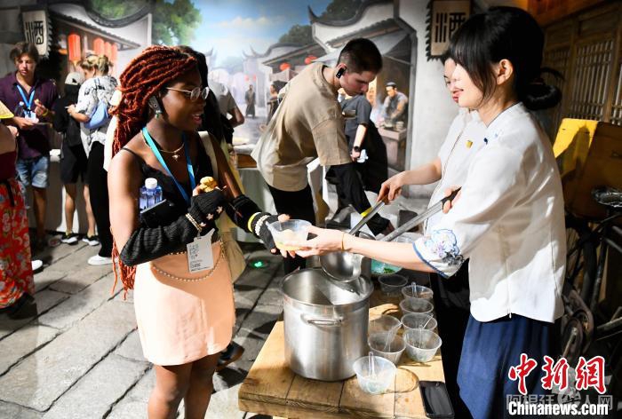 8月27日,福建福州,第二十三届“汉语桥”世界大学生中文比赛全球决赛的参赛选手品尝福州小吃。 中新社记者 王东明 摄