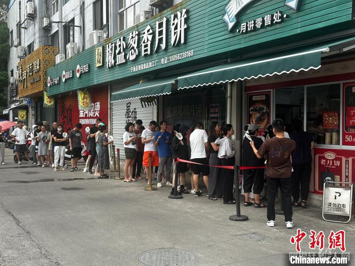 近日,在位于宁波市宁海县的“屋顶花园椒盐葱香月饼”铺子门前,排满了前来选购月饼的人。