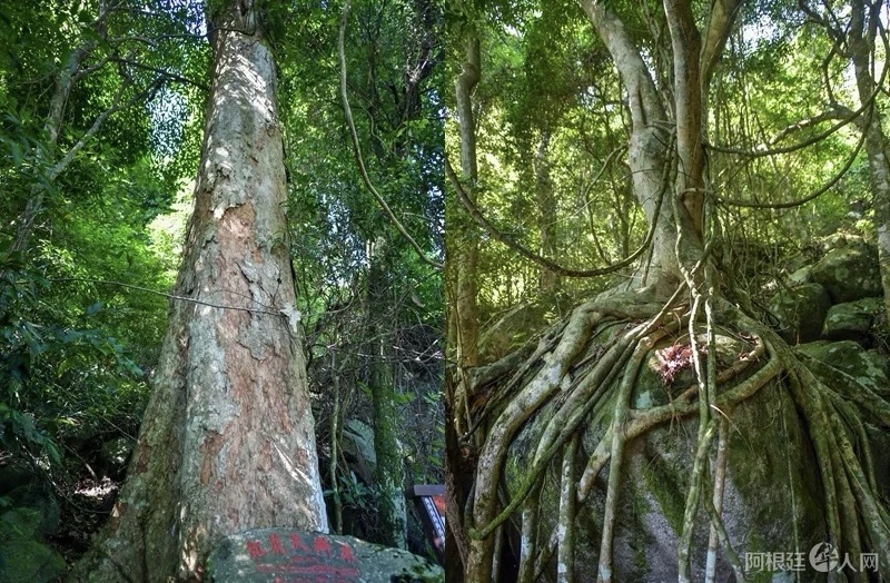 在海南霸王岭自然保护区热带雨林中,左图为树龄1130年的红花天料木。右图为“根抱石”现象。骆云飞摄(拼图)