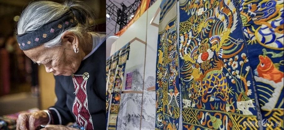 左图为一位面部有文身的黎族阿婆正在绣黎锦。右图为海南黎族龙被亮相消博会。骆云飞摄(拼图)