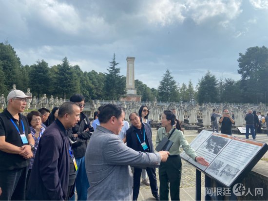 英魂无言,松涛阵阵。在松山抗战遗址,采访团一行向抗战英烈敬献鲜花,怀着激动的心情探访了目前保存最为完好的二战战场遗址。松山战役纪念碑前的中国远征军雕塑群由老兵方阵、娃娃兵方阵、炮兵方阵等13个雕塑方阵402座雕塑组成,古榕树上还保留着当年的弹孔,向今天的人们诉说着当年战役的惨烈。“我在参观中国远征军雕塑群时,巧遇一名穿着粉色衣服的女孩穿梭于娃娃兵方阵里,给塑像手里塞糖果。我看到在庞大的方阵里,塑像的手里、脚下,甚至是‘枪托’里,都塞满了五颜六色的糖果和零食。我想,这包含的不仅是人们对抗战英雄们的缅怀,更多的是心疼,他们用最直接和最质朴的行动在诉说着和平年代的人们对这些先烈们的感激之情。”采访团成员、尼日利亚西非统一商报副社长王淑华感动地说道。