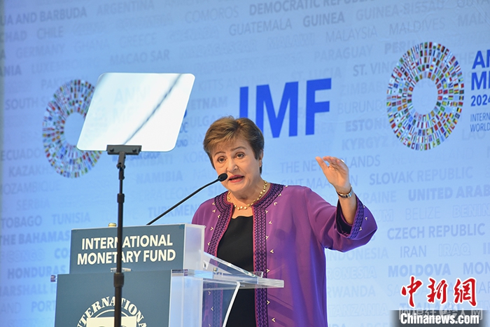 当地时间10月17日,国际货币基金组织(IMF)总裁格奥尔基耶娃在华盛顿发表讲话说,未来低增长和高债务并存的局面将给全球经济带来压力。 中新社记者 沙晗汀 摄