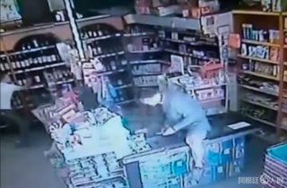 事发一幕被店内的监控录像记录了下来。从画面中可以看出,一名歹徒闯入店内恐吓收银员,后者被吓得后退几步;歹徒见状爬上了柜台,并打开了收款机。