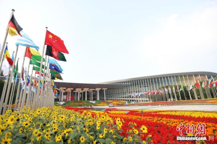 11月4日,国家会展中心(上海)南广场的进博会主题花坛与迎风飘扬的多国国旗。第七届中国国际进口博览会于11月5日到11月10日在国家会展中心(上海)举办。中新社记者 王紫儒 摄