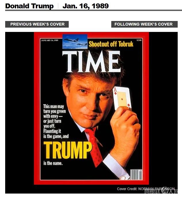1989年,特朗普第一次登上《时代》封面。那一期封面介绍道:“这个男人可能让你羡慕嫉妒恨——手法叫炫富,名字叫特朗普”。当年,身为成功地产商人的特朗普,手持一张扑克牌抵着脑门,眼神里透着运筹帷幄的自信。