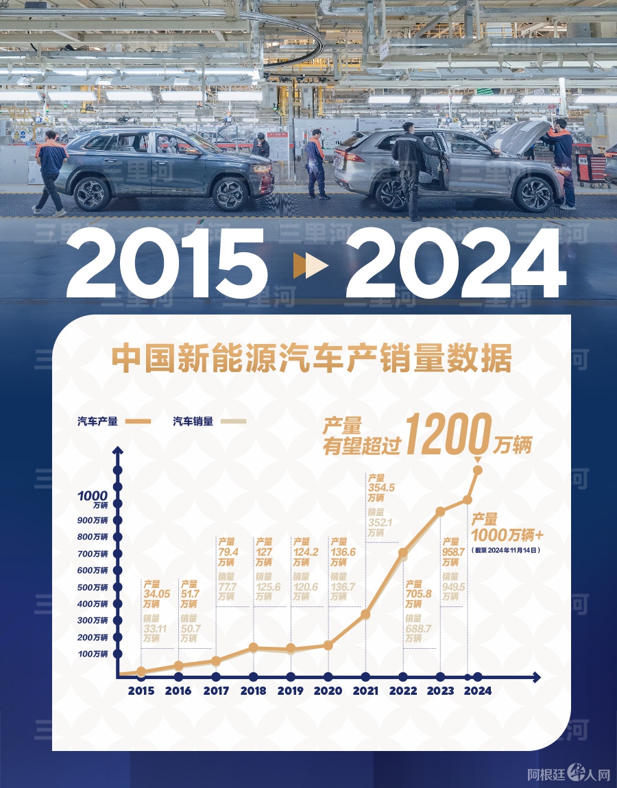 从2009年的“十城千辆”规模推广起步,到2018年年产销量超百万辆,中国用了近10年时间;2022年年产销量逾500万辆,用时约4年;2024年产量突破千万辆,仅约2年。