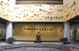 书院中庭上方的设计采用了活字印刷板凹凸造型,展现出汉字悠久的历史与独特的魅力。其顶部文字的灵感便来源于王力的《博白方音实验录》。书院珍藏着王力的大量著作和珍贵的手稿文件,并以“王力与十四箱书的故事”场景展示,让观众感受其不平凡的一生。