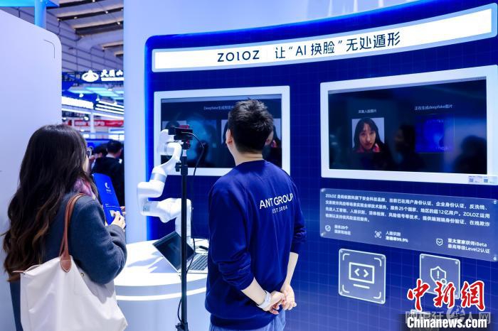 11月21日,2024年世界互联网大会“互联网之光”博览会蚂蚁集团展区,观众在体验了解让“AI换脸”无处遁形的最新技术服务。 中新社记者 陈溯 摄